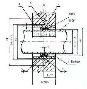 5、Ⅱ型套管穿牆處之牆壁,如遇非混凝土(tǔ)牆壁時應改用混凝土牆壁,其(qí)澆(jiāo)注混凝土範圍,Ⅱ型套管應比翼(yì)環直徑(D4)大200mm,而且必須將套管一次澆固於牆內。套(tào)管內的填料應緊密搗實。